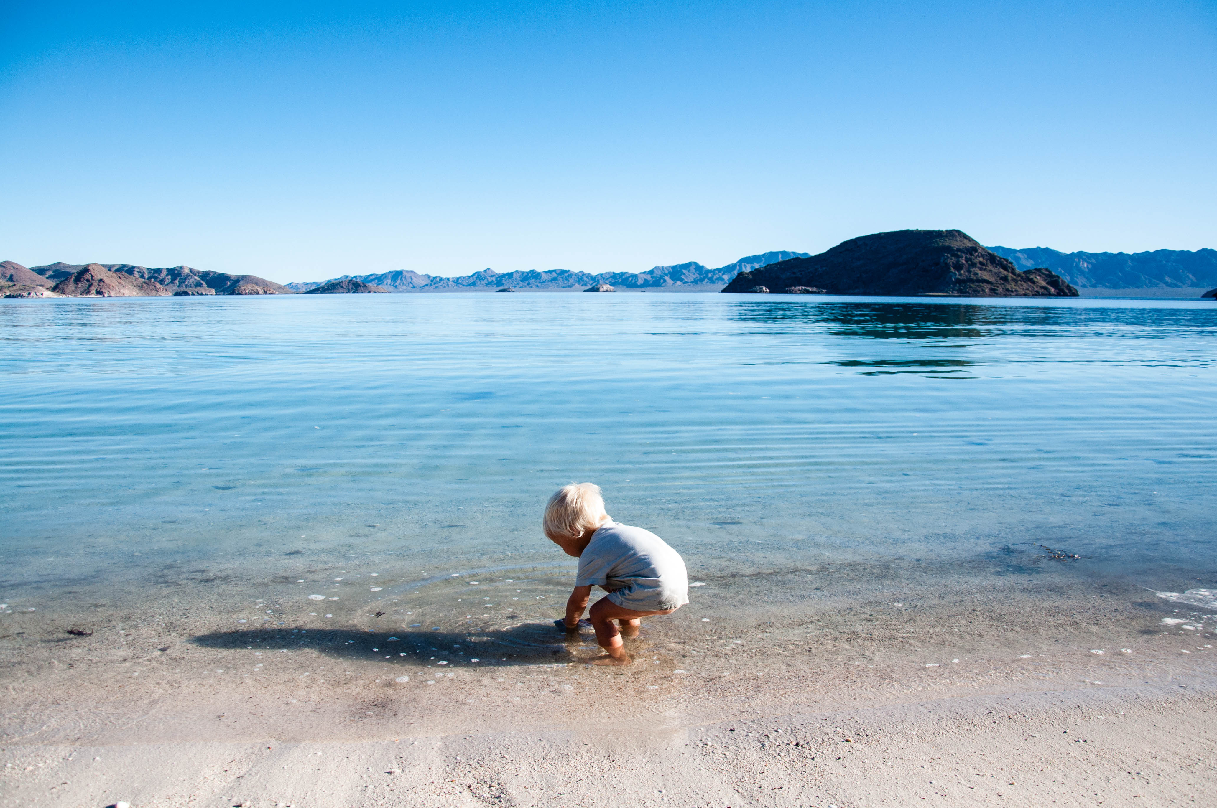 Der Campingplatz „El Coyote“ lag traumhaft schön in einer Bucht mit kleinen Inseln, türkisblauem Wasser und schönem Sandstrand. Unser Auto stand bei Flut ganze zwei Meter vom Meer entfernt und wie wir später noch erfahren durften, klang es bei nächtlichem Wind so, als ob wir unsere Zelte auf dem Dach eines Hausboots aufgebaut hätten. Manchmal unheimlich weil irre laut, meistens aber schön. Auch hatten wir wieder ein Palapa – eine Palmwedelhütte – das als Spiel-Koch-Wohn-Rumpel-Höhle schnell ein zusätzliches Zimmer für uns wurde.