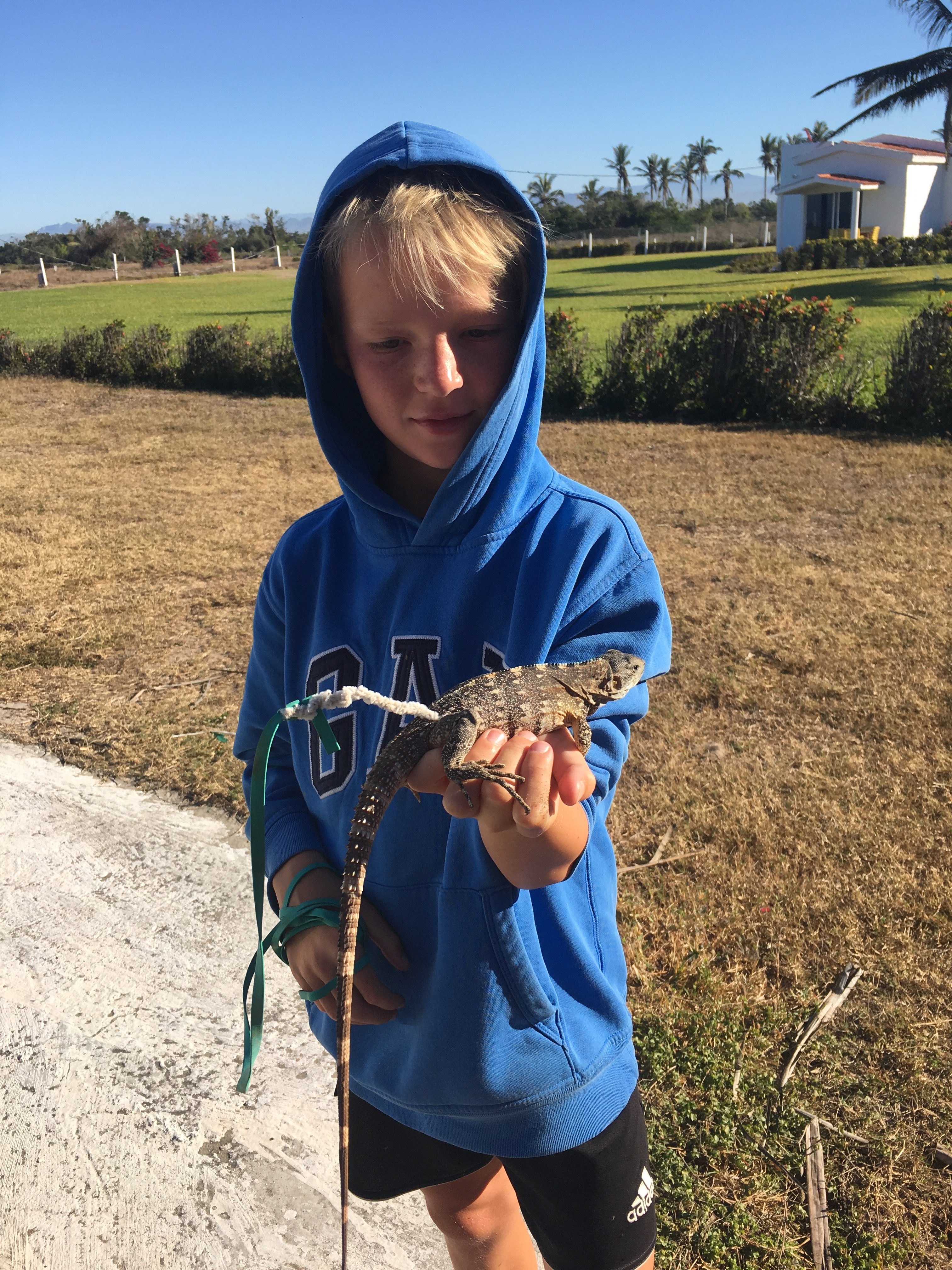 Und das taten wir, nicht nur am Geburtstag, sondern auch noch an den drei folgenden Tagen. Es war so schön und unkompliziert, dass wir Tag für Tag entschieden, noch zu bleiben. Marko fuhr mit dem Rad in ein kleines Dorf zum Einkaufen, wo er im „Tía-Emma-Lädchen“ von der Milch bis zur Kabelbefestigung allerlei kaufen konnte, die Jungs machten sich einen Leguan zum temporären Haustier (mit Leine!), wir verbrachten viel Zeit im Pool und ich schaffte es endlich, wieder ein bisschen Spanisch zu lernen. Leider geht das sehr schleppend…